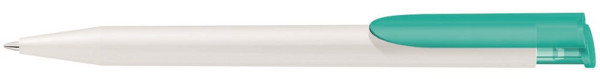 Druckkugelschreiber mit gedeckt mattem Gehäuse in weiß und farbig transparent gefrostetem Clipdrücker.