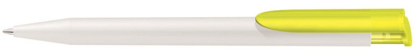 Druckkugelschreiber mit gedeckt mattem Gehäuse in weiß und farbig transparent gefrostetem Clipdrücker.