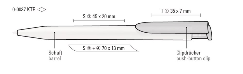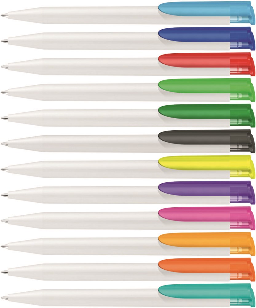 Druckkugelschreiber mit gedeckt mattem Gehäuse in weiß und farbig transparent gefrostetem Clipdrücker.