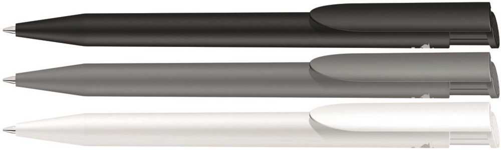 Druckkugelschreiber mit gedeckt mattem Gehäuse und Clipdrücker aus recyceltem Kunststoff. mehr