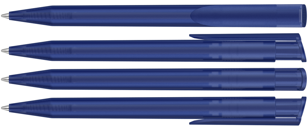 Druckkugelschreiber mit transparent gefrostetem Gehäuse und Clipdrücker.