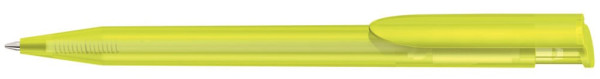 Druckkugelschreiber mit transparent gefrostetem Gehäuse und Clipdrücker.