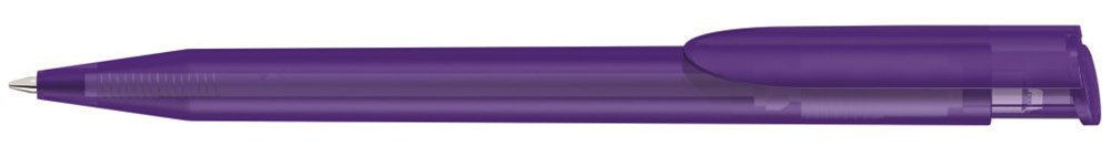 Druckkugelschreiber mit transparent gefrostetem Gehäuse und Clipdrücker.