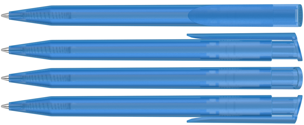 Druckkugelschreiber mit transparent gefrostetem Gehäuse und Clipdrücker.