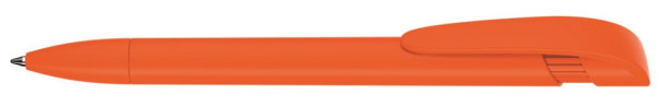 Druckkugelschreiber mit gedeckt mattem Gehäuse, breitem Bogenclipdrücker und Spitze.