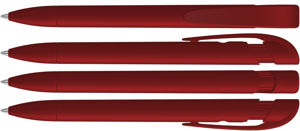 Druckkugelschreiber mit gedeckt mattem Gehäuse, breitem Bogenclipdrücker und Spitze.