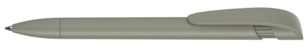 Druckkugelschreiber mit gedeckt mattem Gehäuse, breitem Bogenclipdrücker und Spitze.