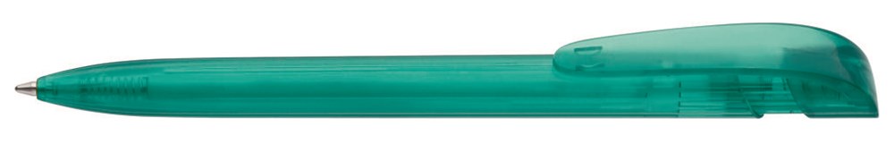 Druckkugelschreiber mit transparent glänzendem Gehäuse und breitem Bogenclipdrücker.