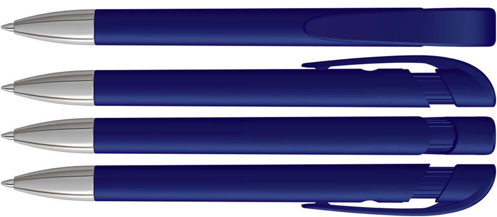 Druckkugelschreiber mit gedeckt mattem Gehäuse, breitem Bogenclipdrücker und silberner Spitze glanzverchromt.