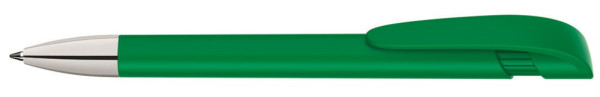Druckkugelschreiber mit gedeckt mattem Gehäuse, breitem Bogenclipdrücker und silberner Spitze glanzverchromt.
