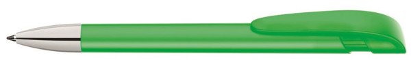 Druckkugelschreiber mit gedeckt mattem Gehäuse, breitem Bogenclipdrücker und silberner Spitze glanzverchromt.