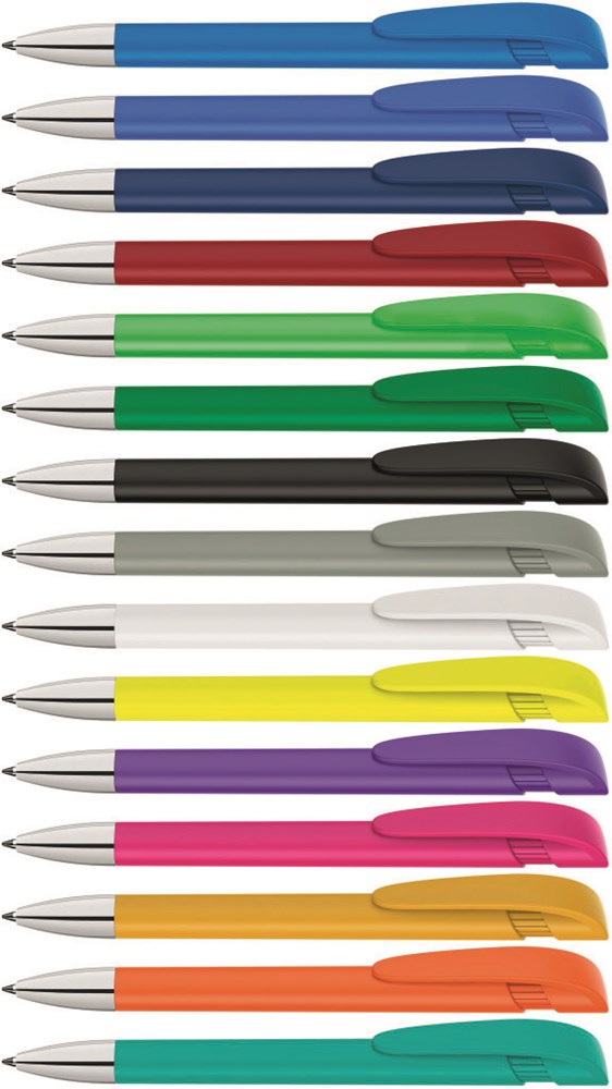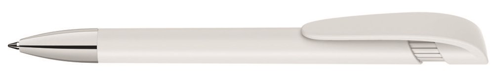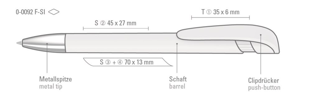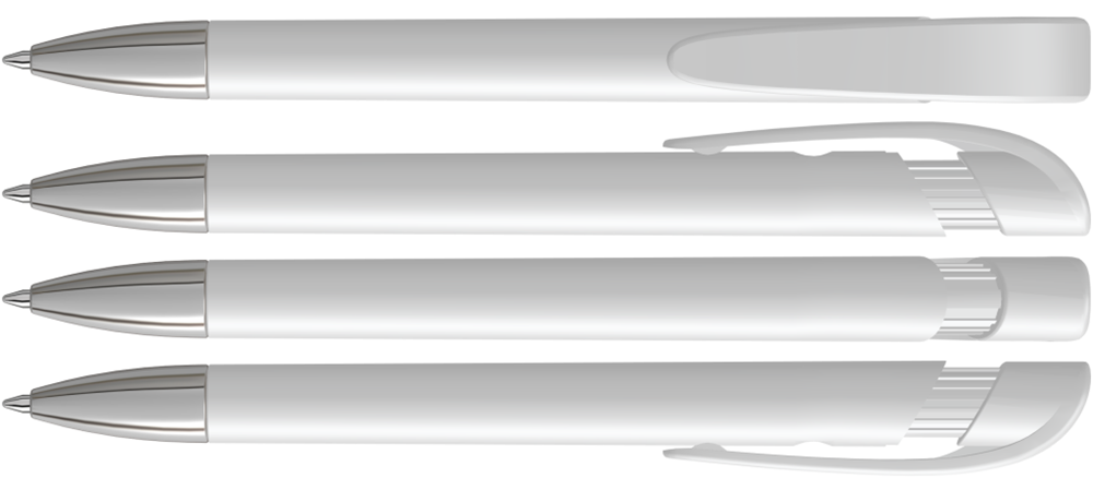 Druckkugelschreiber mit gedeckt mattem Gehäuse, breitem Bogenclipdrücker und silberner Spitze glanzverchromt.