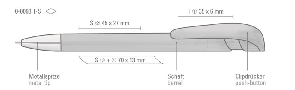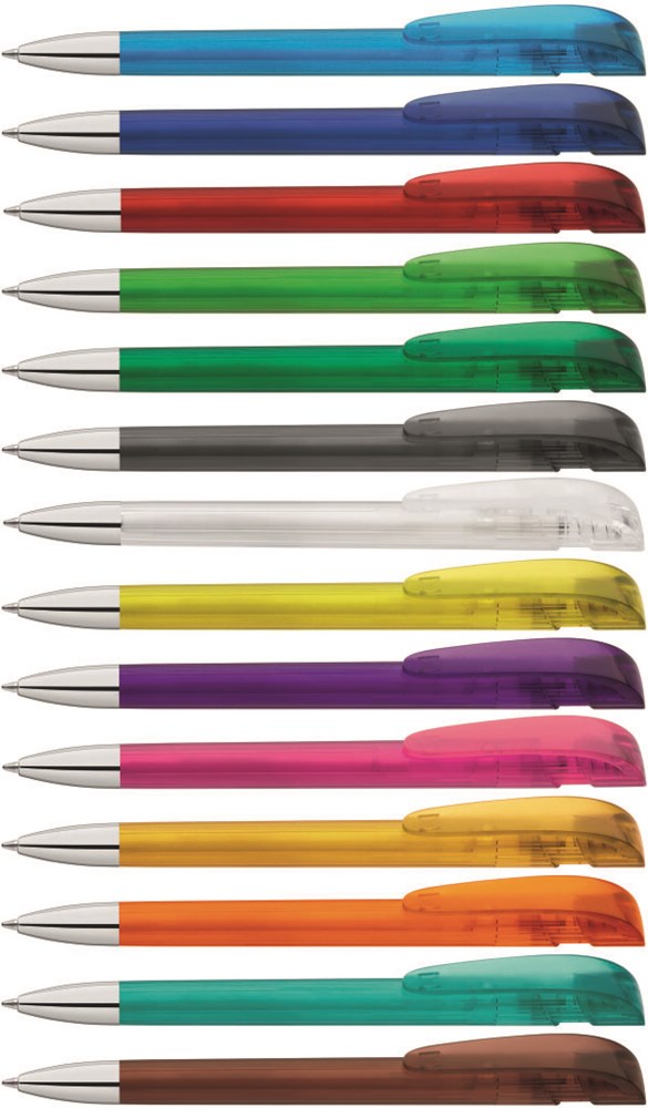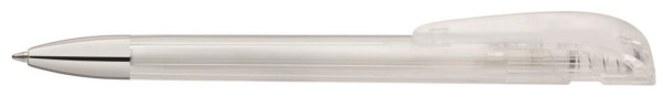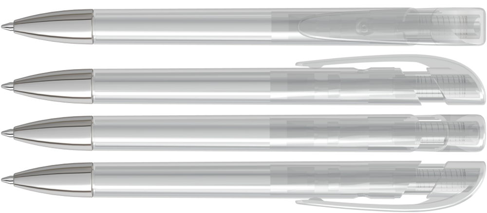 Druckkugelschreiber mit transparent glänzendem Gehäuse, breitem Bogenclipdrücker und schwerer Metallspitze glanzverchromt.