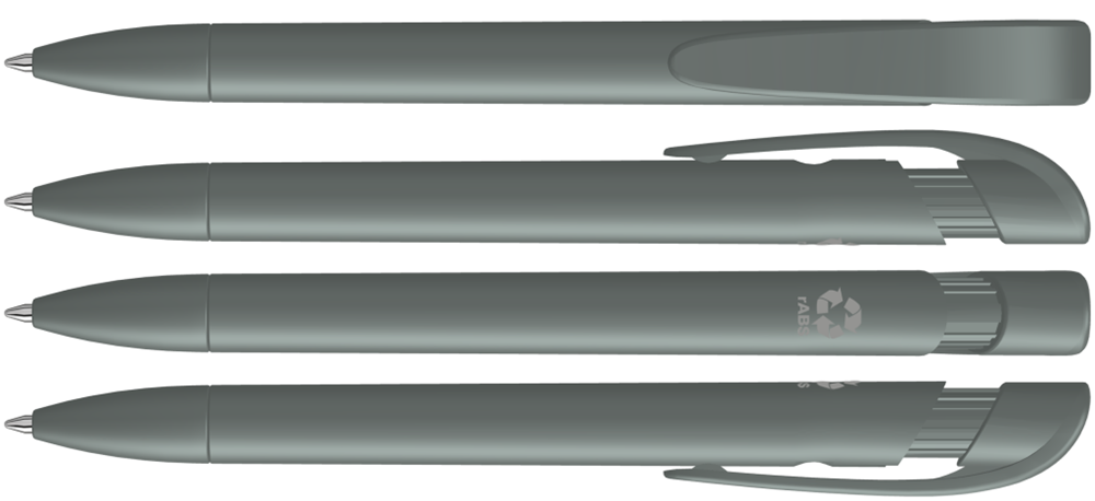 Druckkugelschreiber mit gedeckt mattem Gehäuse, breitem Bogenclipdrücker und Spitze aus recyceltem Kunststoff.
