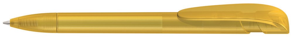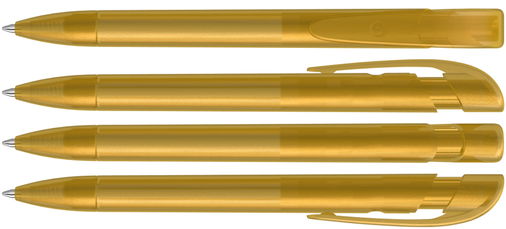 Druckkugelschreiber mit transparent gefrostetem Gehäuse, breitem Bogenclipdrücker und Spitze.