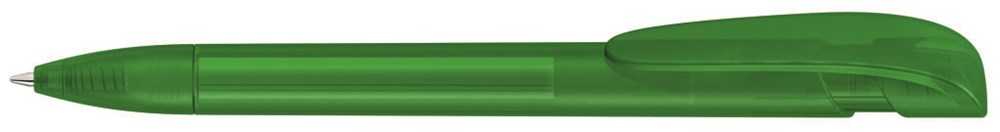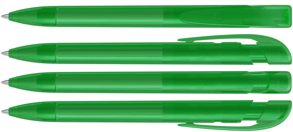 Druckkugelschreiber mit transparent gefrostetem Gehäuse, breitem Bogenclipdrücker und Spitze.