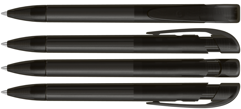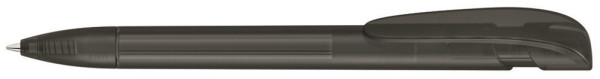 Druckkugelschreiber mit transparent gefrostetem Gehäuse, breitem Bogenclipdrücker und Spitze.