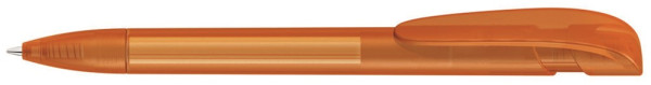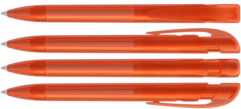 Druckkugelschreiber mit transparent gefrostetem Gehäuse, breitem Bogenclipdrücker und Spitze.