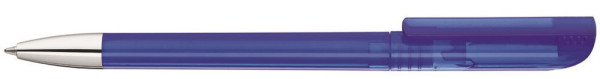 Drehkugelschreiber mit transparent glänzendem Gehäuse, gefrosteter Clipoberfläche und Spitze glanzverchromt.