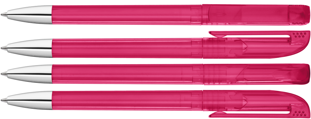 Drehkugelschreiber mit transparent glänzendem Gehäuse, gefrosteter Clipoberfläche und Spitze glanzverchromt.