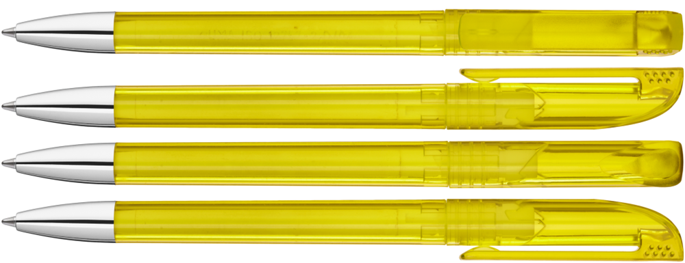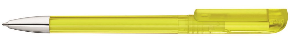 Drehkugelschreiber mit transparent glänzendem Gehäuse, gefrosteter Clipoberfläche und Spitze glanzverchromt.