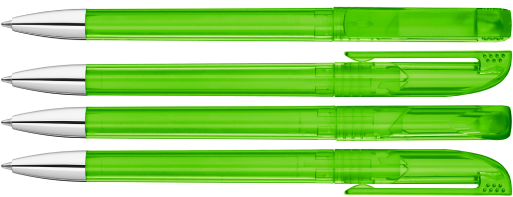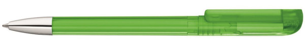 Drehkugelschreiber mit transparent glänzendem Gehäuse, gefrosteter Clipoberfläche und Spitze glanzverchromt.