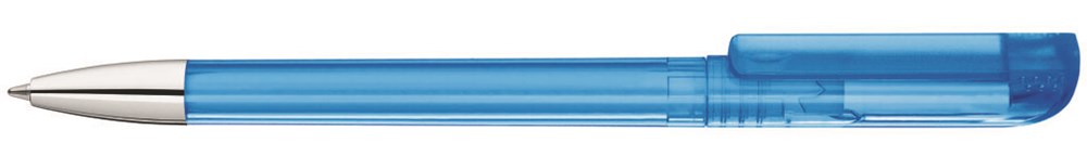 Drehkugelschreiber mit transparent glänzendem Gehäuse, gefrosteter Clipoberfläche und Spitze glanzverchromt.