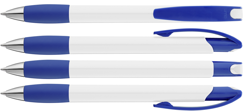 Druckkugelschreiber mit gedeckt glänzendem Gehäuse in weiß, farbiger Gummigriffzone und Clipdrücker. Drückerstopfen und Spitze in silber glänzend.