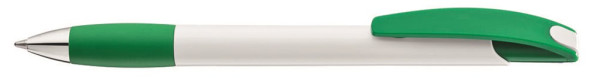 Druckkugelschreiber mit gedeckt glänzendem Gehäuse in weiß, farbiger Gummigriffzone und Clipdrücker. Drückerstopfen und Spitze in silber glänzend.