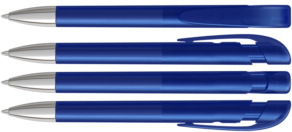 Druckkugelschreiber mit transparent gefrostetem Gehäuse, breitem Bogenclipdrücker und silberner Spitze glanzverchromt.