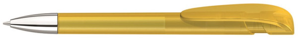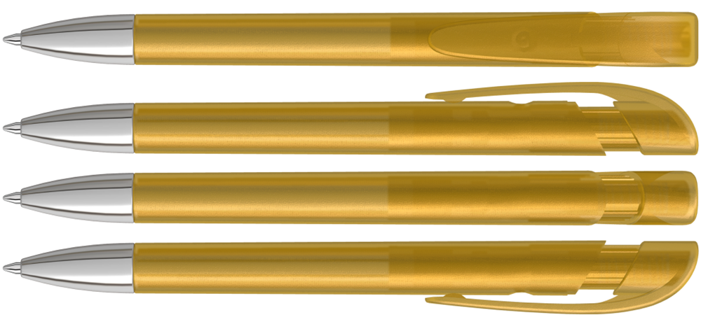 Druckkugelschreiber mit transparent gefrostetem Gehäuse, breitem Bogenclipdrücker und silberner Spitze glanzverchromt.