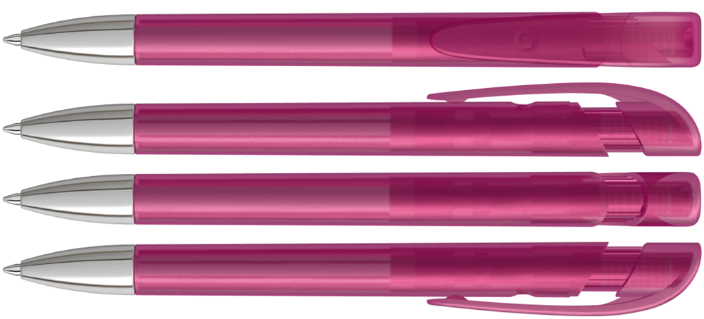 Druckkugelschreiber mit transparent gefrostetem Gehäuse, breitem Bogenclipdrücker und silberner Spitze glanzverchromt.