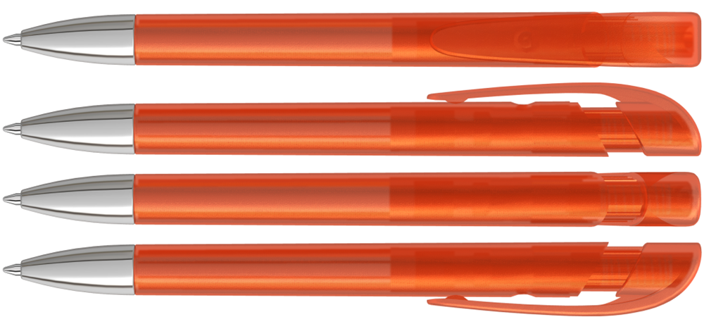 Druckkugelschreiber mit transparent gefrostetem Gehäuse, breitem Bogenclipdrücker und silberner Spitze glanzverchromt.