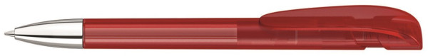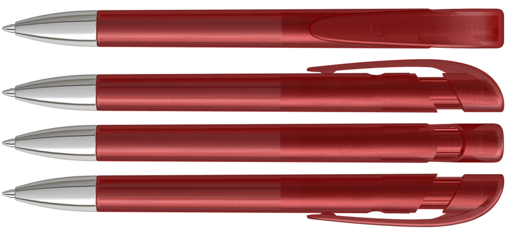 Druckkugelschreiber mit transparent gefrostetem Gehäuse, breitem Bogenclipdrücker und silberner Spitze glanzverchromt.
