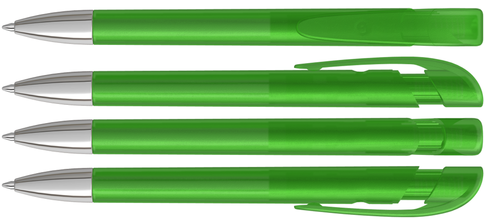 Druckkugelschreiber mit transparent gefrostetem Gehäuse, breitem Bogenclipdrücker und silberner Spitze glanzverchromt.