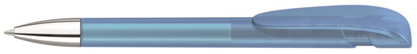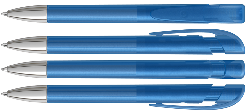 Druckkugelschreiber mit transparent gefrostetem Gehäuse, breitem Bogenclipdrücker und silberner Spitze glanzverchromt.
