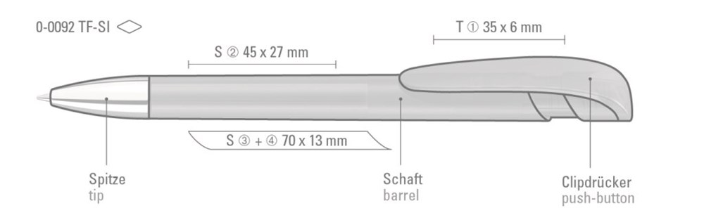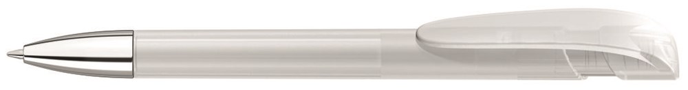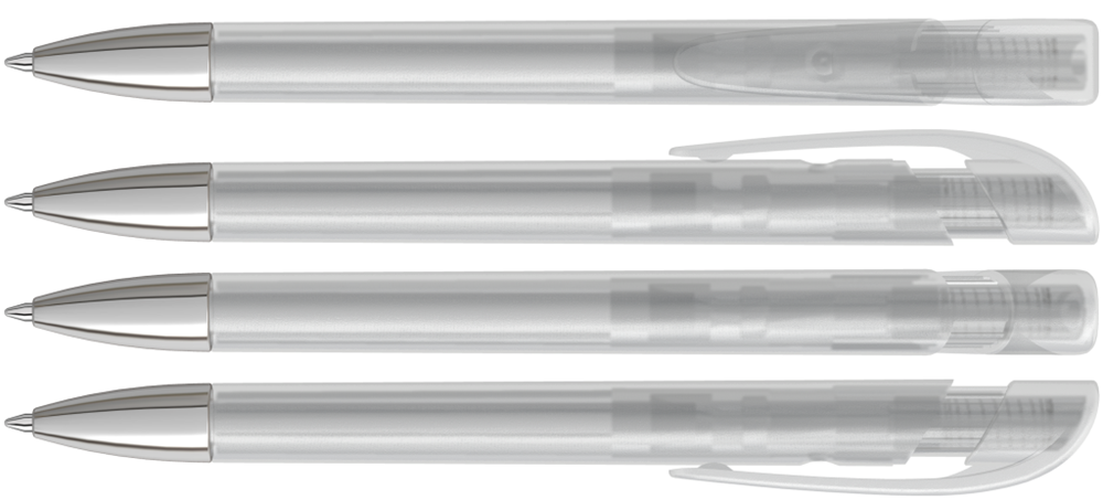 Druckkugelschreiber mit transparent gefrostetem Gehäuse, breitem Bogenclipdrücker und silberner Spitze glanzverchromt.