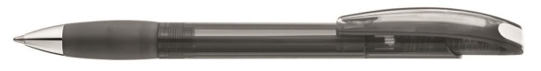Druckkugelschreiber mit transparent glänzendem Gehäuse, Gummigriffzone und Clipdrücker. Drückerstopfen und Spitze silber glänzend.