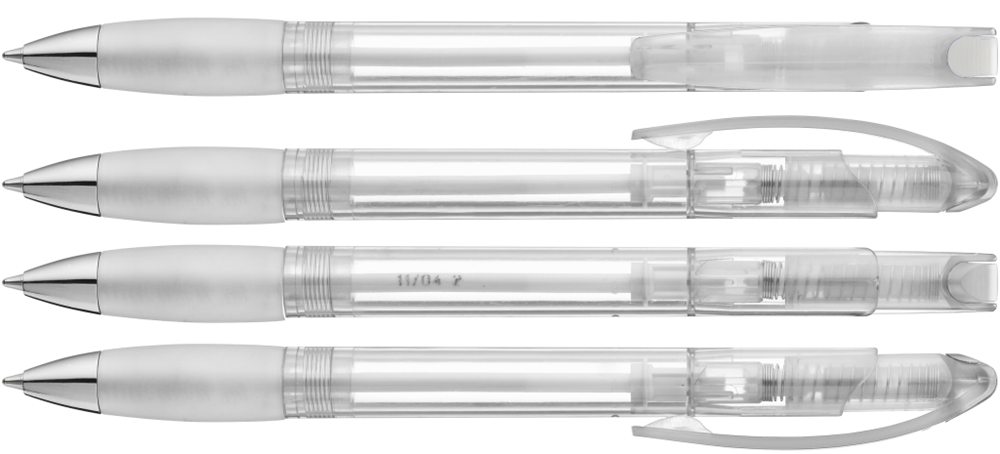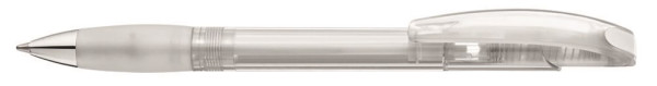 Druckkugelschreiber mit transparent glänzendem Gehäuse, Gummigriffzone und Clipdrücker. Drückerstopfen und Spitze silber glänzend.