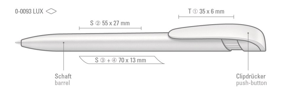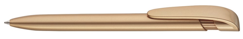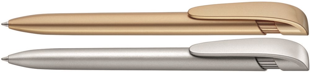 Druckkugelschreiber mit gedeckt glänzendem Gehäuse in silber oder gold und breitem Bogenclipdrücker. mehr