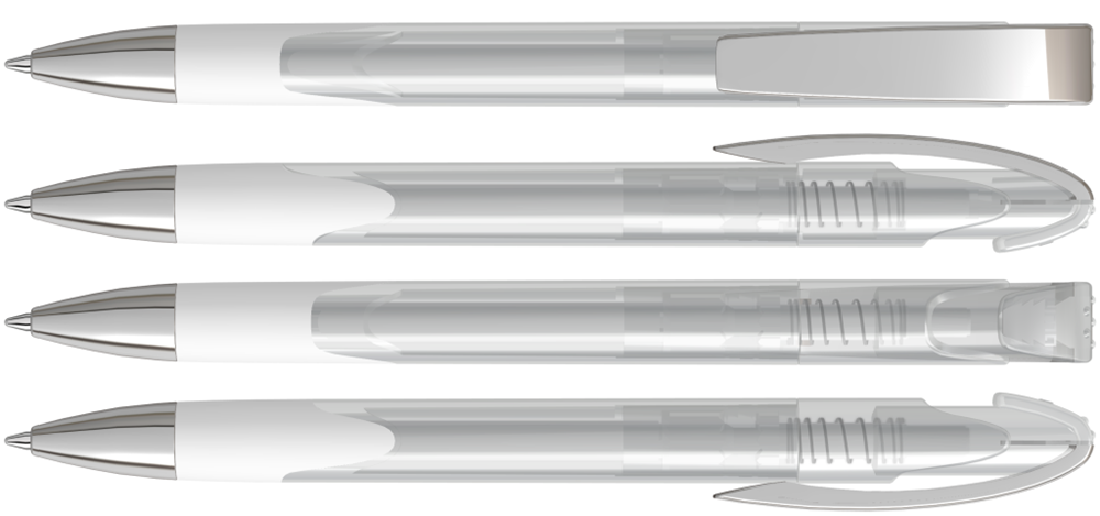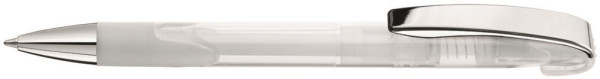 Druckkugelschreiber mit transparent glänzendem Gehäuse, Gummigriffzone, schwerer Metallspitze und Metallclip glanzverchromt.