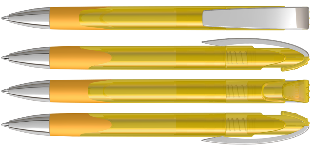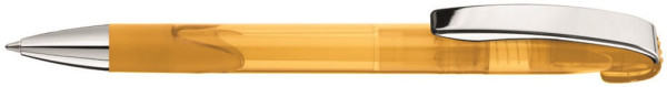 Druckkugelschreiber mit transparent glänzendem Gehäuse, Gummigriffzone, schwerer Metallspitze und Metallclip glanzverchromt.
