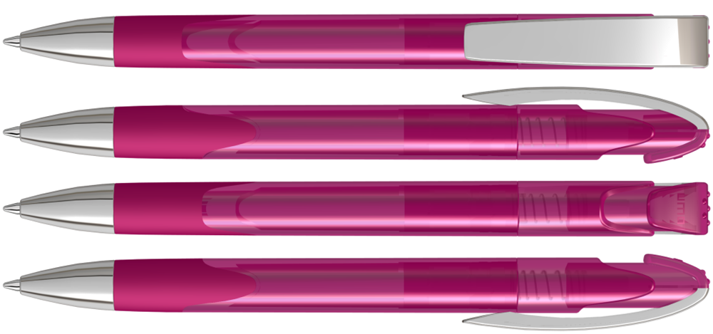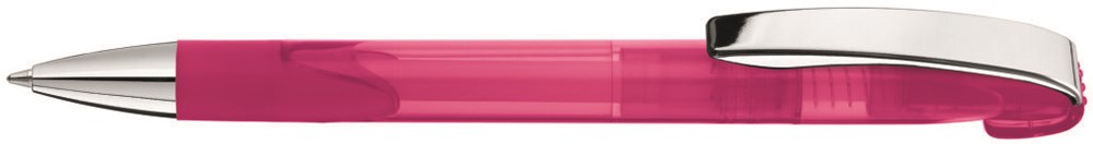 Druckkugelschreiber mit transparent glänzendem Gehäuse, Gummigriffzone, schwerer Metallspitze und Metallclip glanzverchromt.