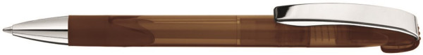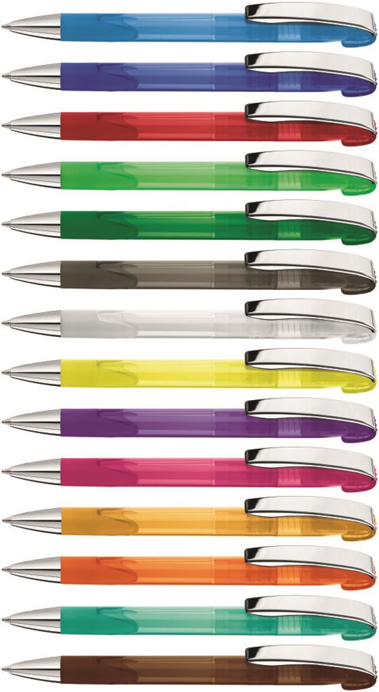 Druckkugelschreiber mit transparent glänzendem Gehäuse, Gummigriffzone, schwerer Metallspitze und Metallclip glanzverchromt.