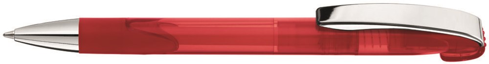 Druckkugelschreiber mit transparent glänzendem Gehäuse, Gummigriffzone, schwerer Metallspitze und Metallclip glanzverchromt.