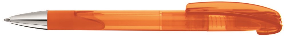 Druckkugelschreiber mit transparent glänzendem Gehäuse, Gummigriffzone und schwerer Metallspitze glanzverchromt.