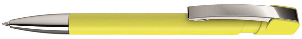 Druckkugelschreiber mit Softtouch-Gehäuse, flexiblem Metallclip und schwerer Metallspitze glanzverchromt.
