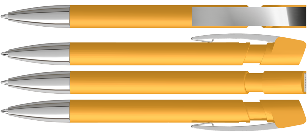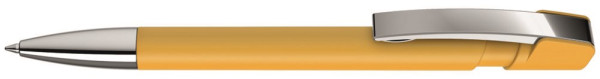 Druckkugelschreiber mit Softtouch-Gehäuse, flexiblem Metallclip und schwerer Metallspitze glanzverchromt.