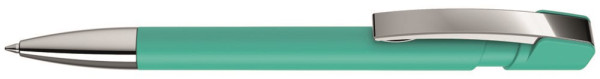 Druckkugelschreiber mit Softtouch-Gehäuse, flexiblem Metallclip und schwerer Metallspitze glanzverchromt.