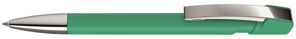Druckkugelschreiber mit Softtouch-Gehäuse, flexiblem Metallclip und schwerer Metallspitze glanzverchromt.